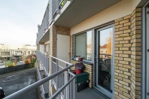 De aparte keuken is praktisch ingedeeld en voorzien van alle nodige comfort. Zowel de leefruimte als de keuken geven uit op het balkon aan de straatzijde, wat zorgt voor extra licht en openheid.